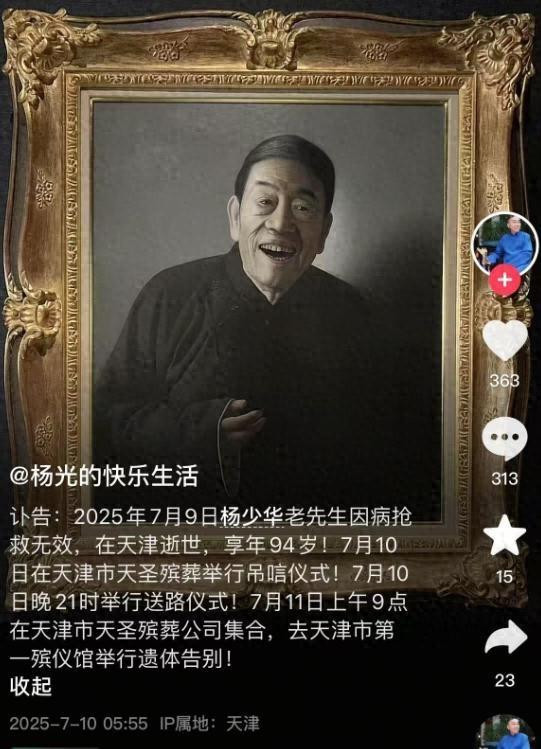 杨少华的离世,不仅是相声界的损失,也让他的家庭陷入了深深的悲痛。